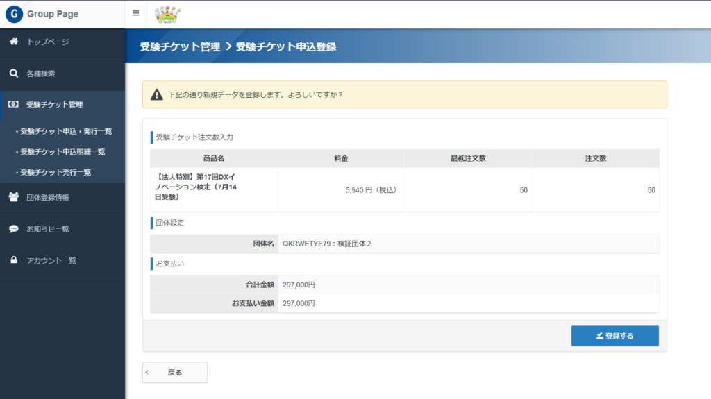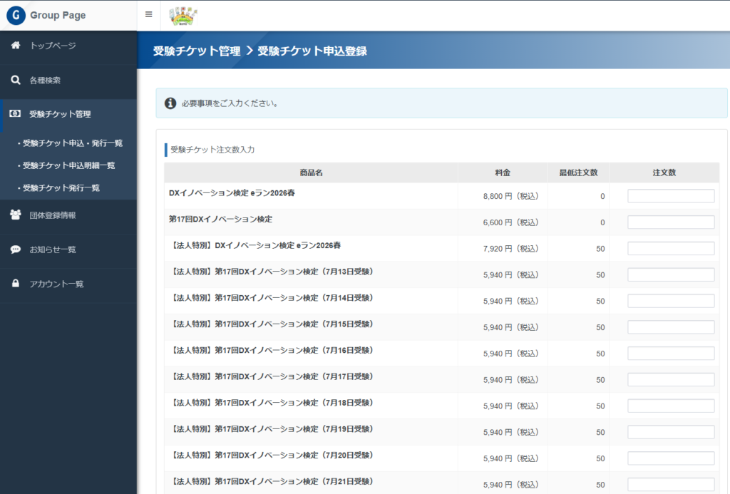 ・団体担当者様にて購入した商品の受験チケットを利用して個々の受験者様が受験します。購入した商品の受験チケット以外は申込ができませんので、ご注意ください。