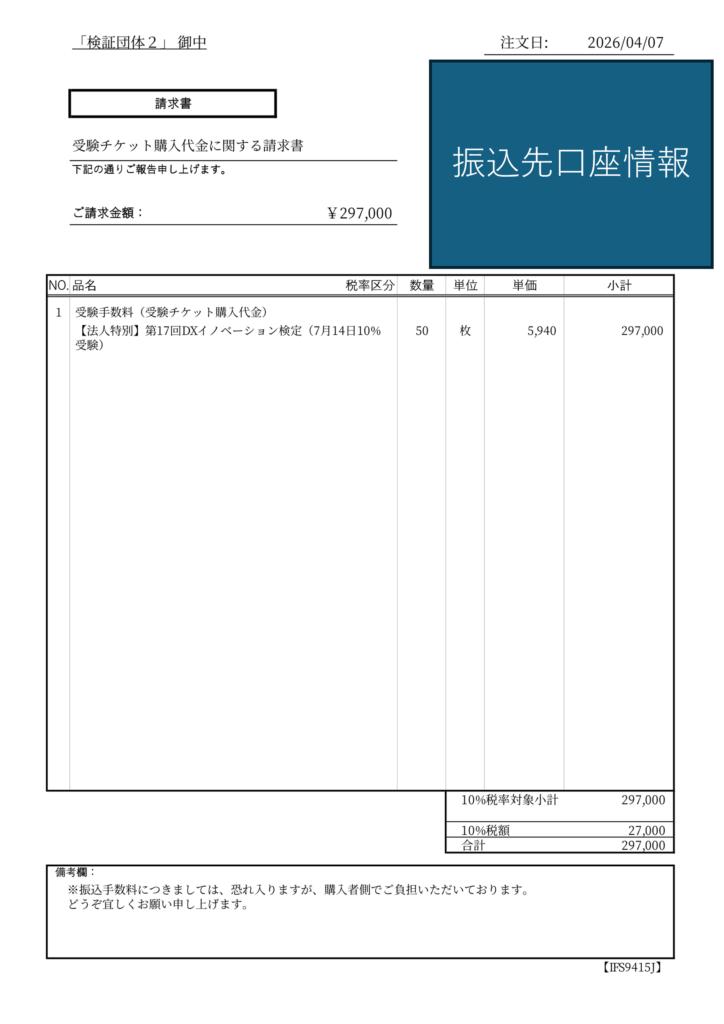 ・お支払いはご注文後、試験システム運用会社から送信される自動メールに記載の指定口座へお振込みいただき、入金確認後、3営業日程度で順次発行されます。