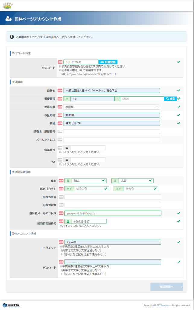 団体情報、団体担当者情報、団体アカウント情報を入力します。